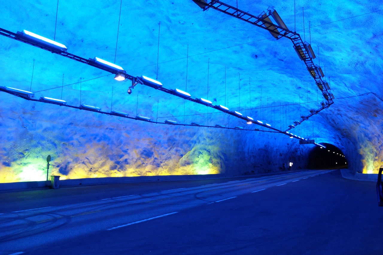 В Лаэрдальском туннеле мы тоже были, но нельзя отказать себе в удовольствии углубиться в него на шесть километров, до первой подсвеченной площадки. Вот она, пещера горного короля — цветной свет и гулкое эхо, хоть оркестр сажай! Любой звук отдаётся так, что аж по ушам бьёт, а уж от шума проехавшей машины даже уши закладывает!