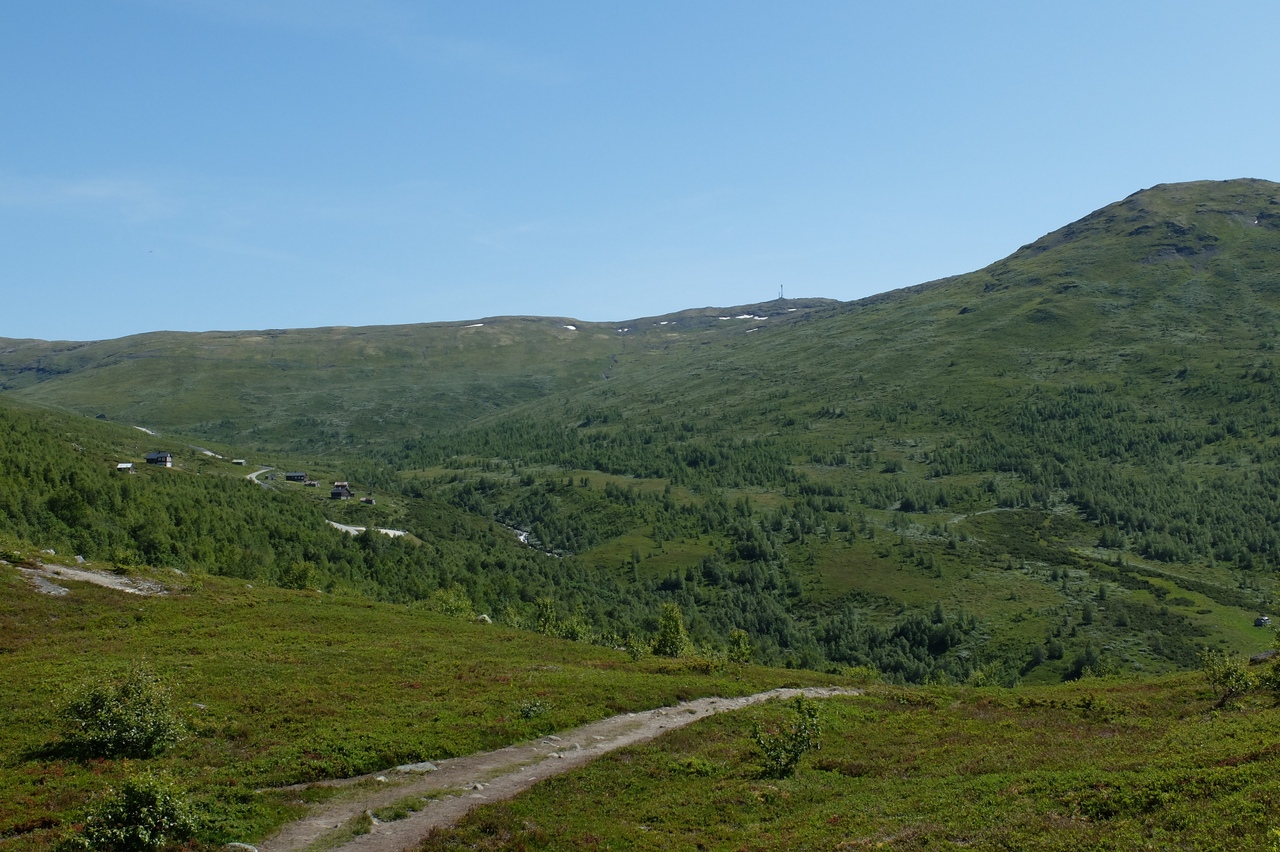 После стоянки дорога начинает идти вниз — правда, с этой стороны нет столь сурового серпантина. На очередном плавном повороте замечаем стоянку с длинным бетонным пандусом, служащим сразу и обзорной площадкой. Горы со снежными вершинами вдали — судя по ракурсу, Йотунхеймен.